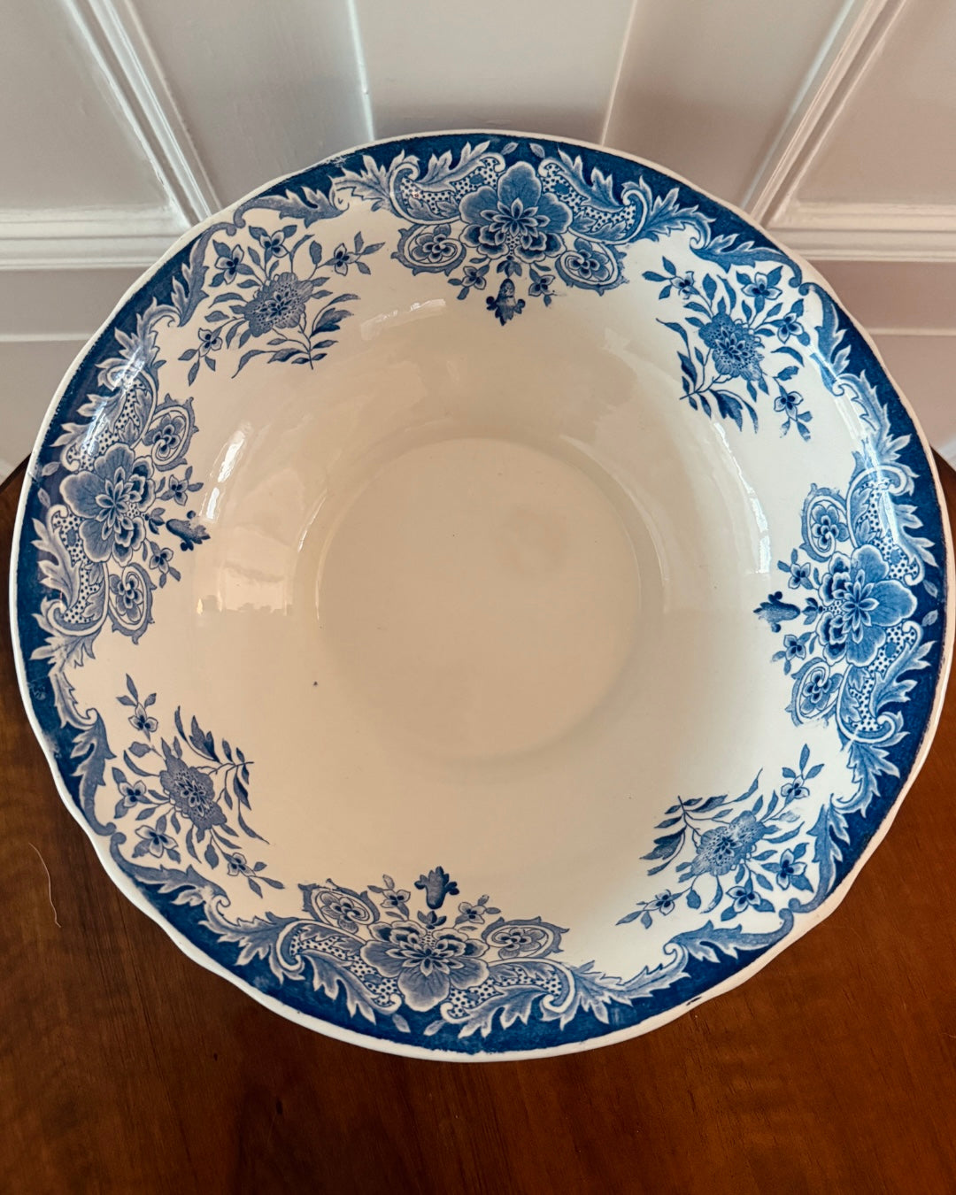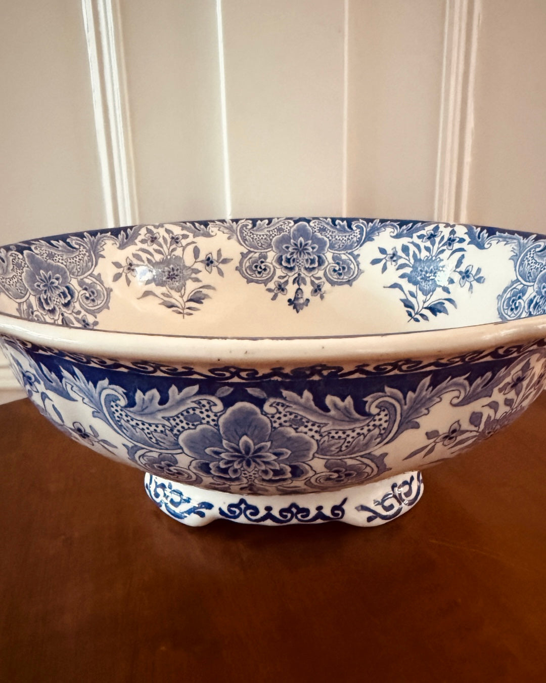 Antieke schaal op voet, uitgevoerd in klassiek blauw-wit Dordrecht-decor, vervaardigd door Boch Frères Keramis in België. Dit gerenommeerde keramiekhuis produceerde vanaf het eind van de 19e eeuw hoogwaardig aardewerk voor de Europese markt, waaronder veel stukken in traditionele Nederlandse stijl.