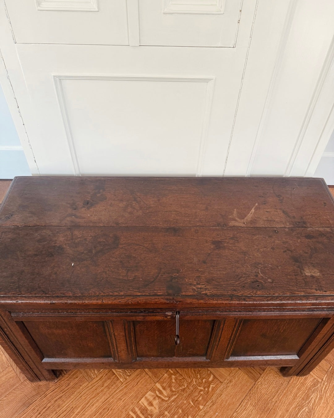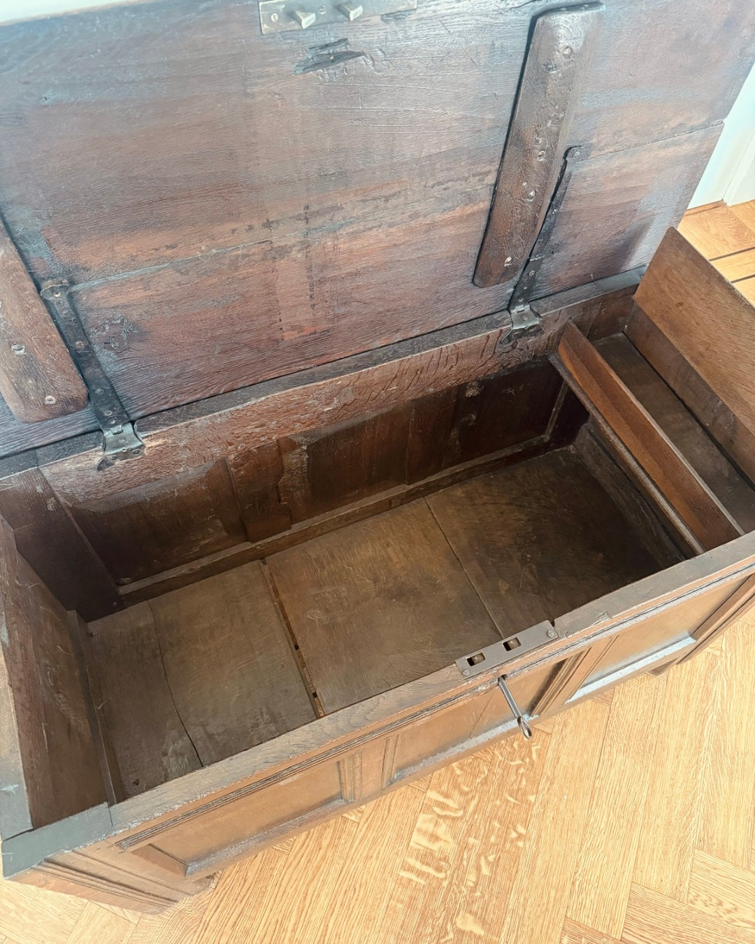 Deze prachtige antieke eikenhouten kist is een stijlvol en karaktervol meubelstuk met een rijke donkere patina en mooi paneelwerk. De kist dateert uit ca. 18e / vroege 19e eeuw en is volledig vervaardigd uit massief eikenhout. Een authentiek detail is dat de originele sleutel nog aanwezig is, samen met de ijzeren scharnieren en het slot.