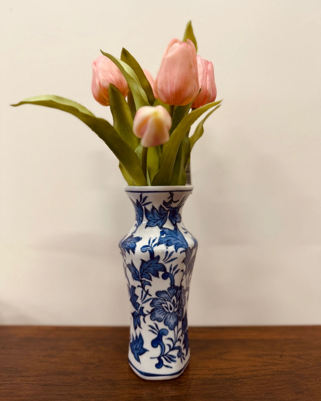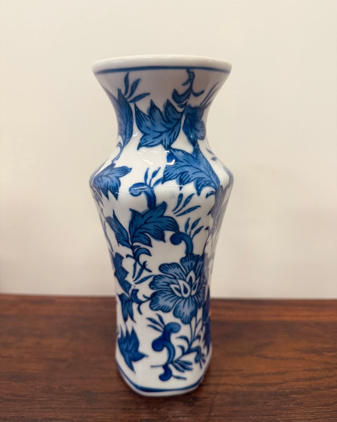 Elegant blauw-wit Chinees vaasje met een klassiek bloemendecor. De slanke hals en sierlijke vorm maken het perfect voor een klein boeketje, een paar takjes of gewoon als decoratief accent op een plank, kast of vensterbank.