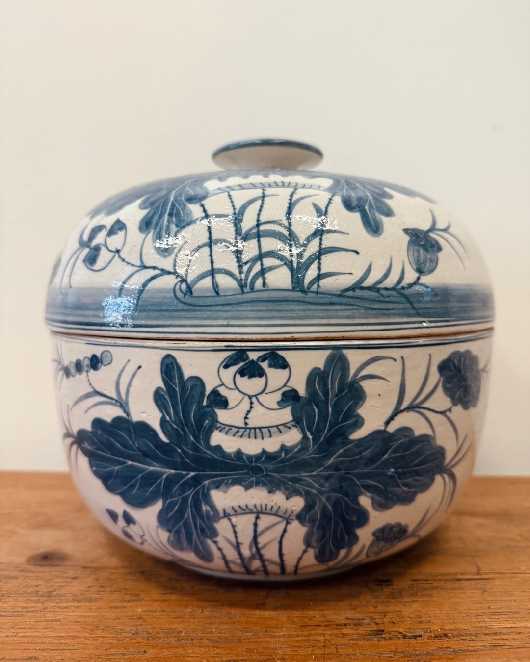 Grote Chinese blauw-witte pot met deksel, handbeschilderd met bloemmotieven. Sierlijk stuk dat direct karakter en elegantie toevoegt aan je interieur!