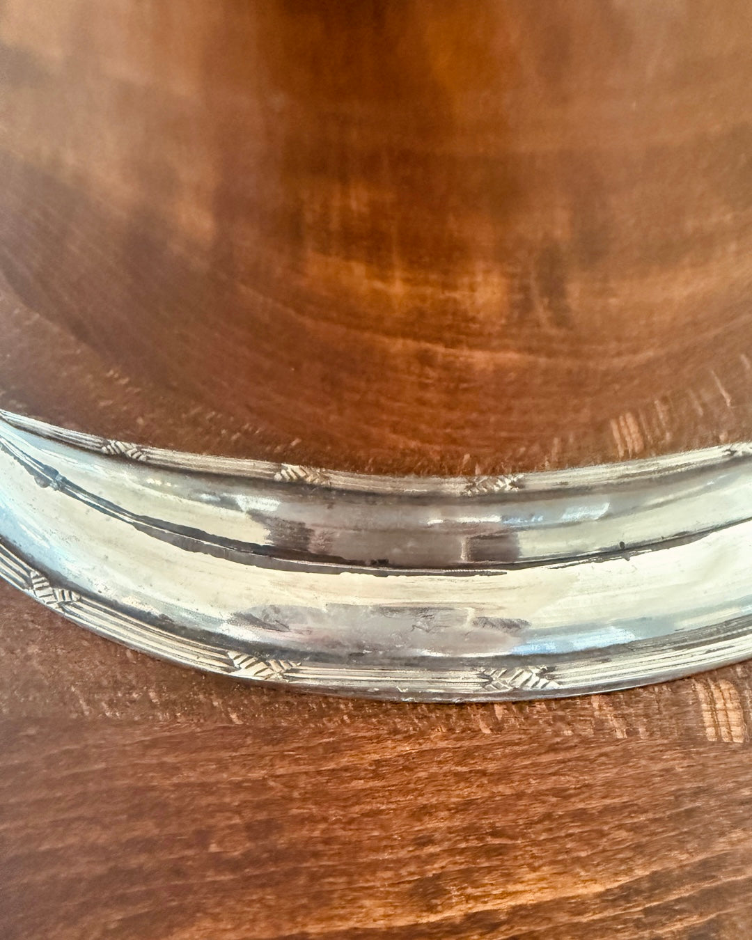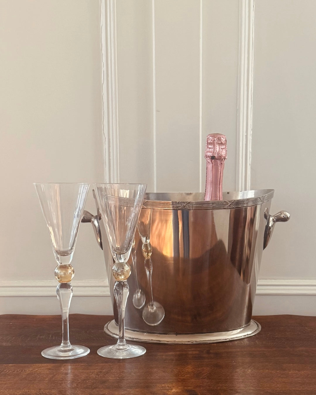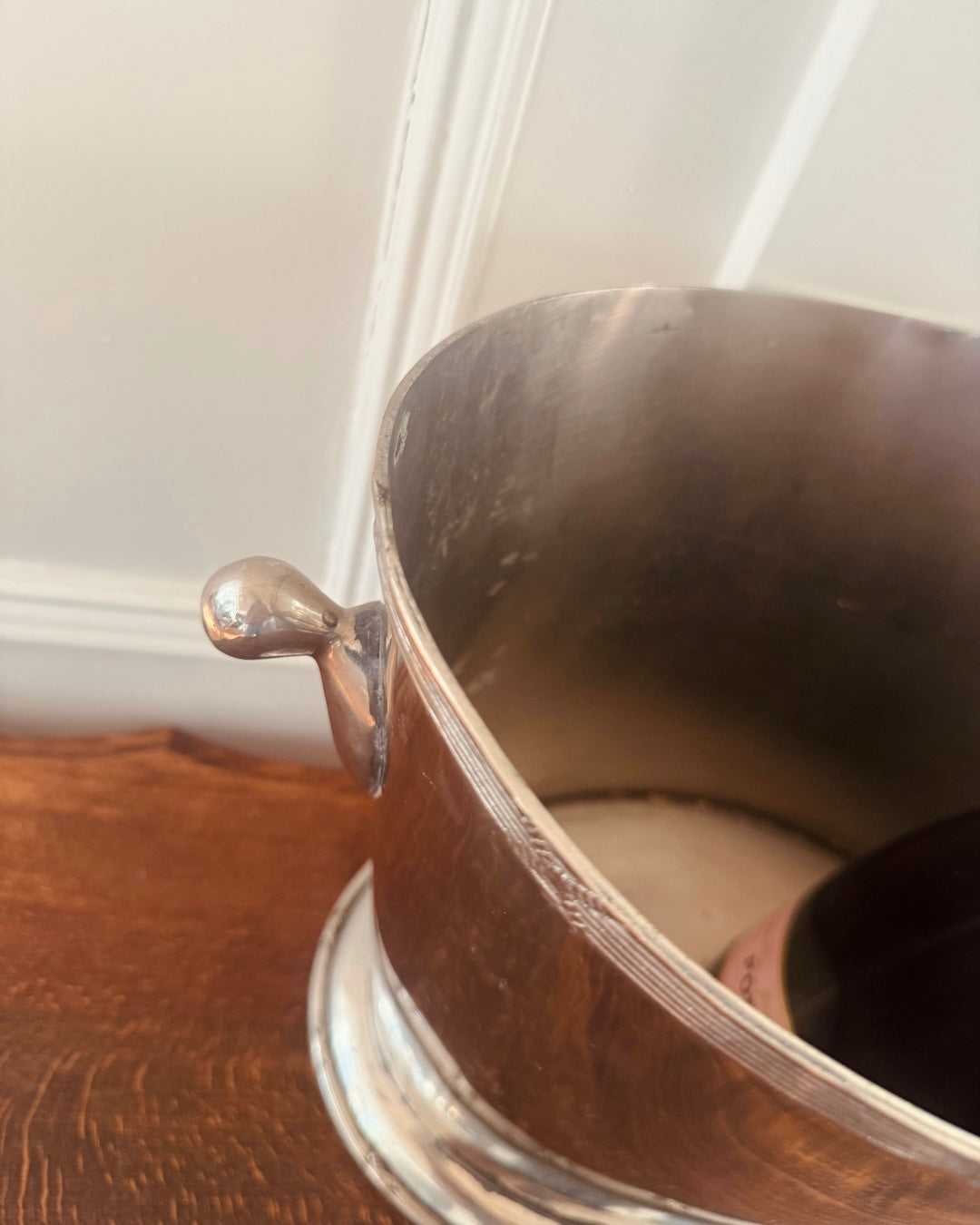 Maak je feest compleet met deze klassieke verzilverde champagnekoeler. Met stijlvolle handvatten en fijne details straalt hij tijdloze elegantie uit. Perfect voor flessen champagne of wijn en ideaal voor speciale gelegenheden. De koeler heeft enkele gebruikssporen, maar dat maakt hem juist charmant. Een feestje voor op tafel!