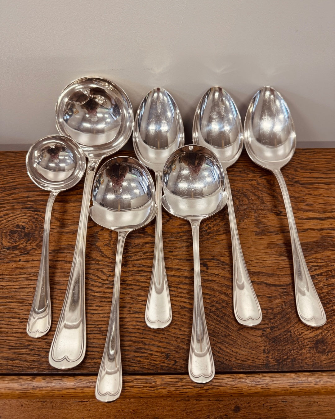 Een elegante set met verschillende serveerlepels voor soep, saus en groenten.