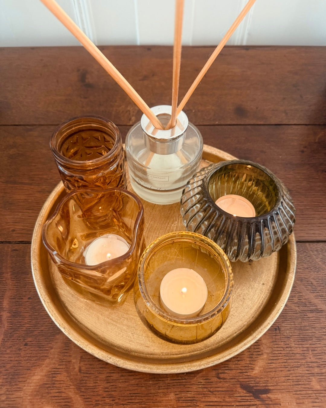 Een subtiel glanzend kaarsenplateau met een warme goudkleurige afwerking. Ideaal als basis voor waxinelichthouders, geurstokjes of kleine vaasjes. De opstaande rand zorgt voor een elegante afwerking én houdt alles mooi op z’n plek. Mooi op een dressoir, salontafel of in een open kast.