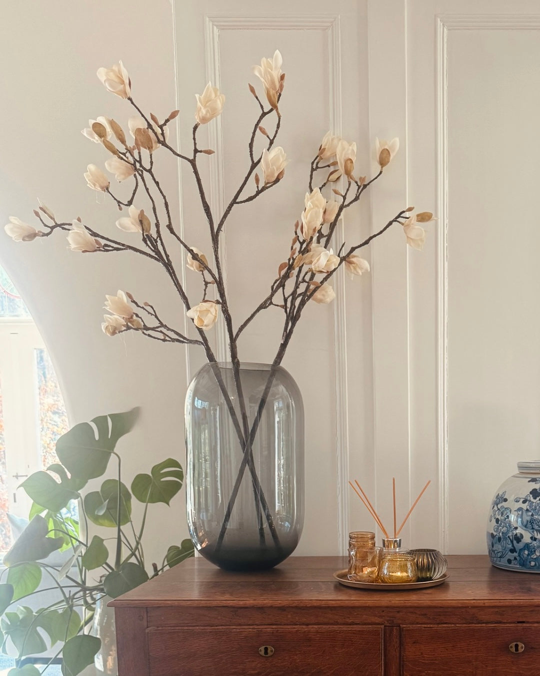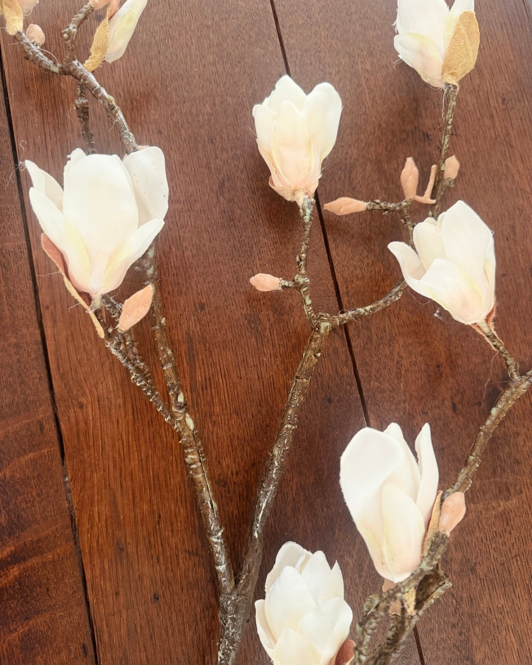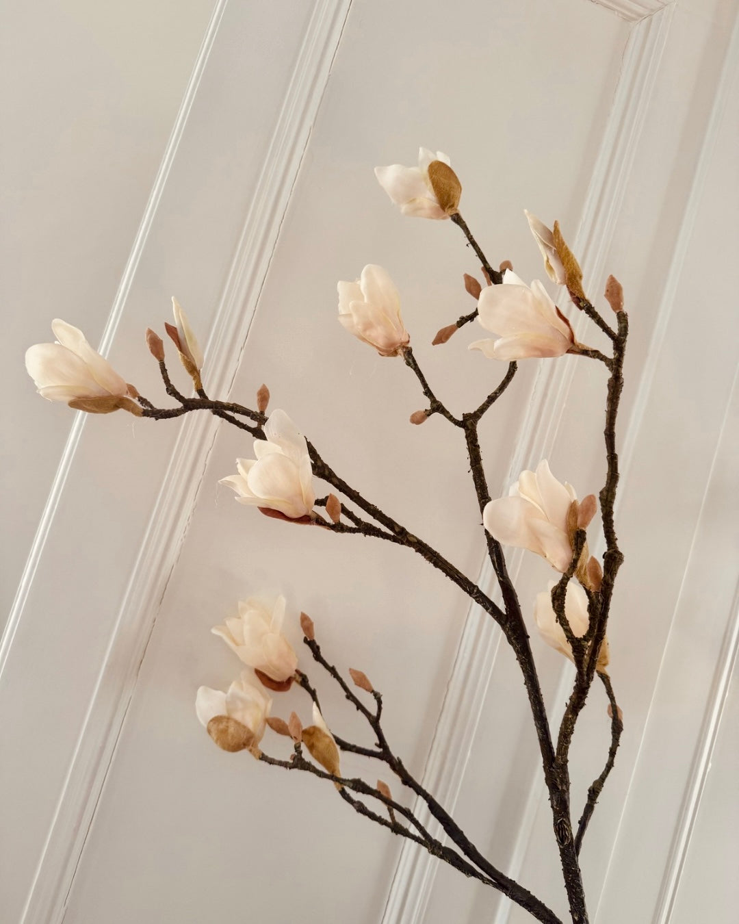 Deze kunsttak met crème magnoliabloemen is bijna niet van echt te onderscheiden. De zachte bloemblaadjes en vertakkingen geven een natuurlijke en elegante uitstraling aan elke vaas. Perfect voor een minimalistisch boeket of om solo te schitteren in een hoge vaas. Tijdloos, stijlvol en onderhoudsvrij — een blijvende sfeermaker in huis.