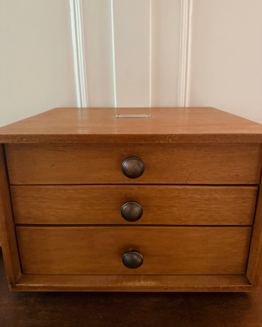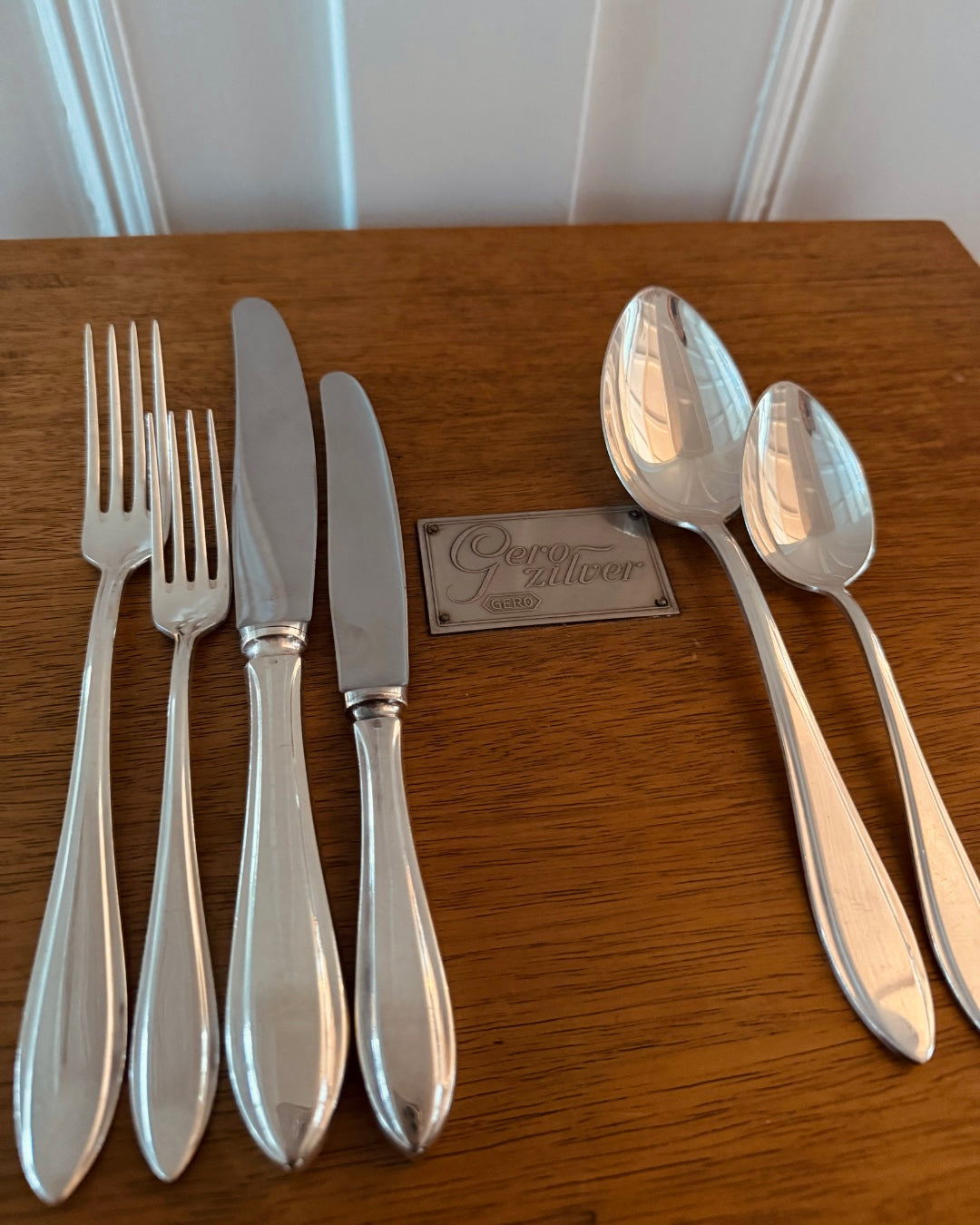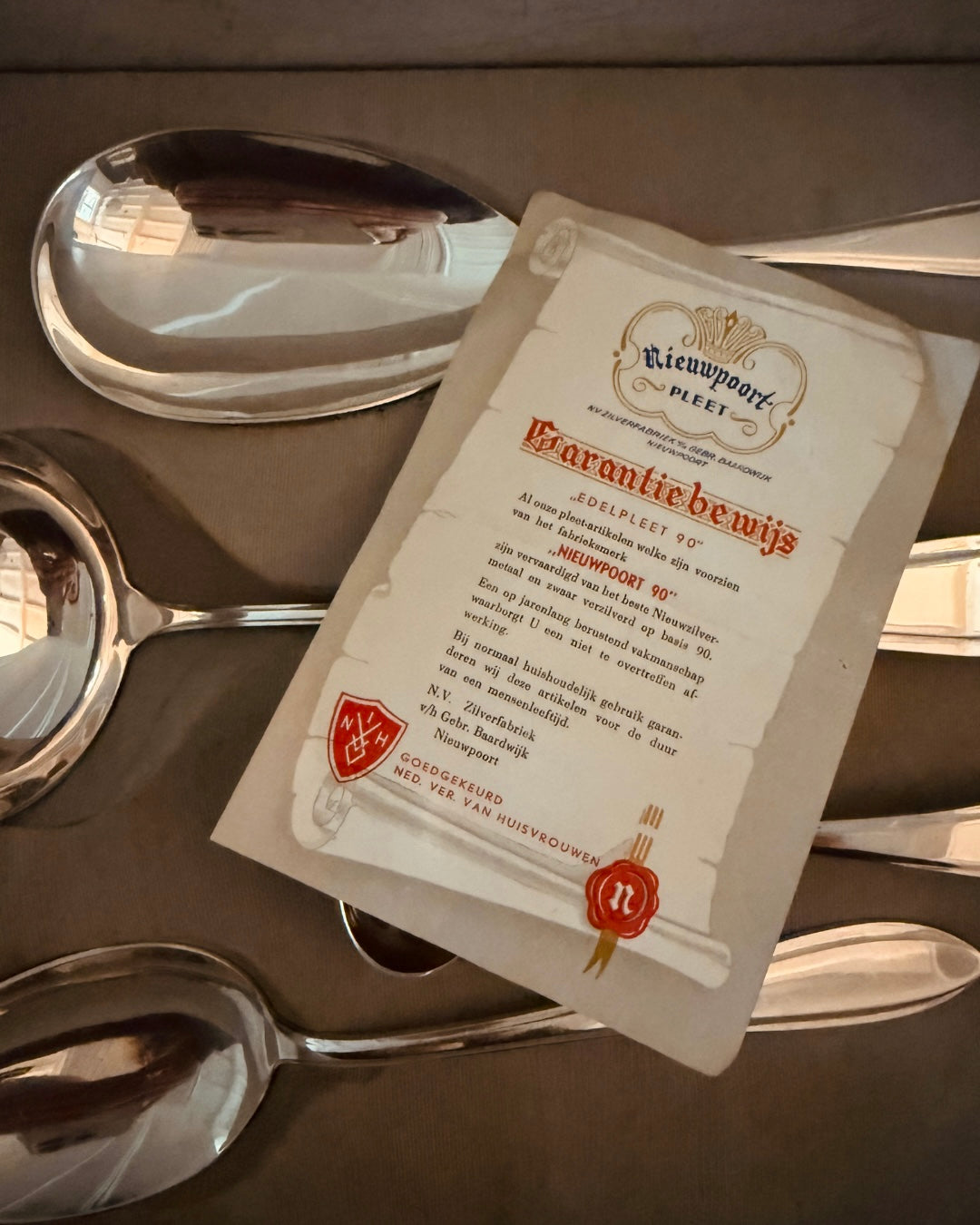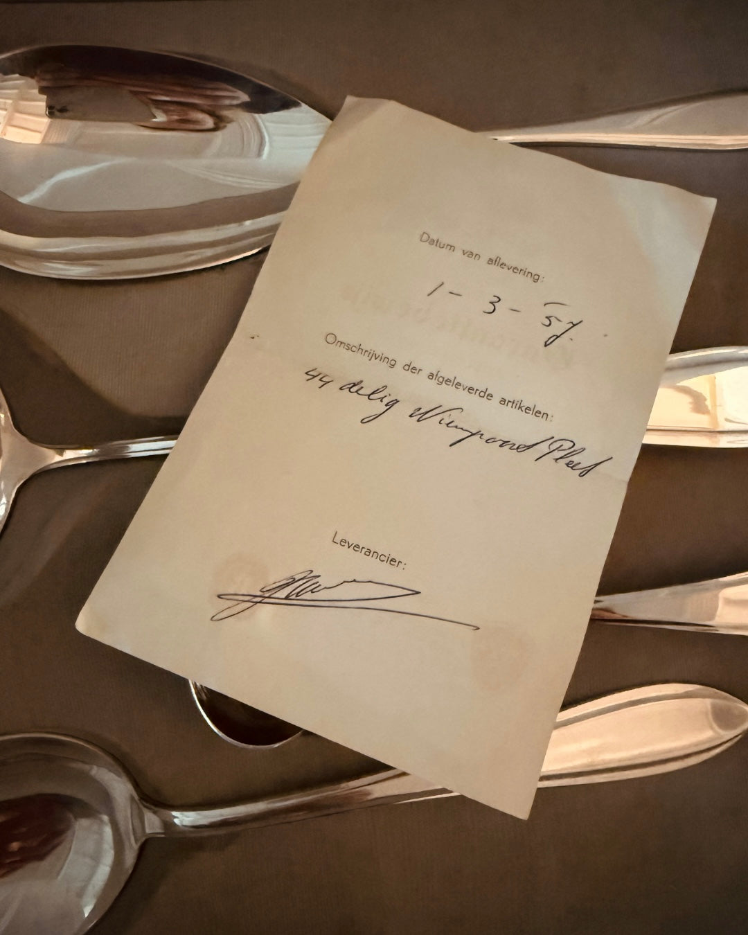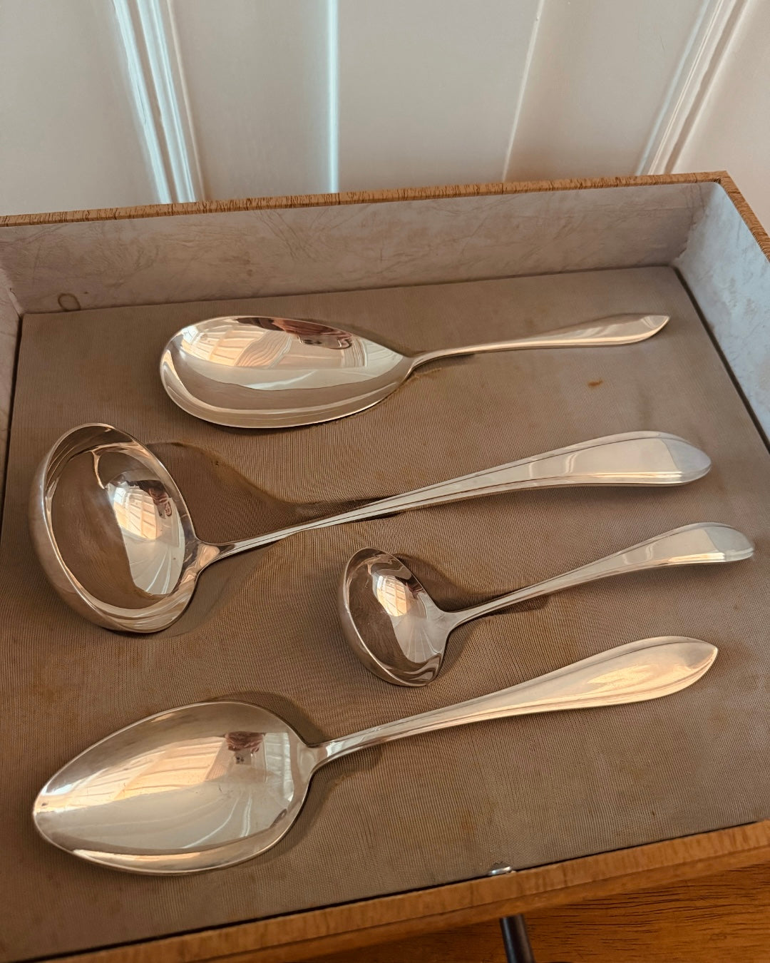 De set komt uit 1957, inclusief het originele garantiebewijs en geleverd in een houten ladekastje. Een zeldzame vondst in deze mooie, glanzende staat.