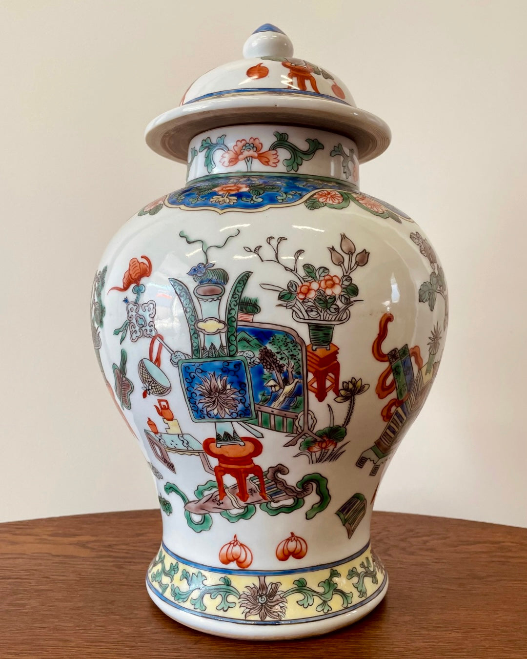 Super mooie grote en zware handbeschilderde Chinese dekselvaas in prachtige kleuren. De details op deze vaas zijn prachtig!