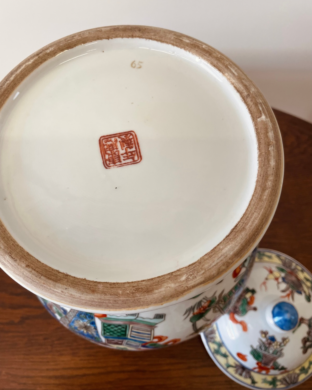 De vaas is gemerkt en genummerd en de decoratie en kleuren wijzen op een stijl die vaak wordt geassocieerd met de Qing-dynastie. Deze vaas is een latere replica, maar daardoor zeker niet minder mooi!