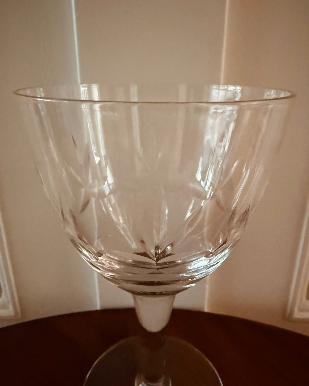 De glazen hebben een mooie balans tussen elegantie en gebruiksgemak: slanke steel, stabiele voet en een helder, licht geslepen patroon dat het licht prachtig vangt. Met het mooie grote formaat een sfeervolle aanvulling voor liefhebbers van vintage tafelen.