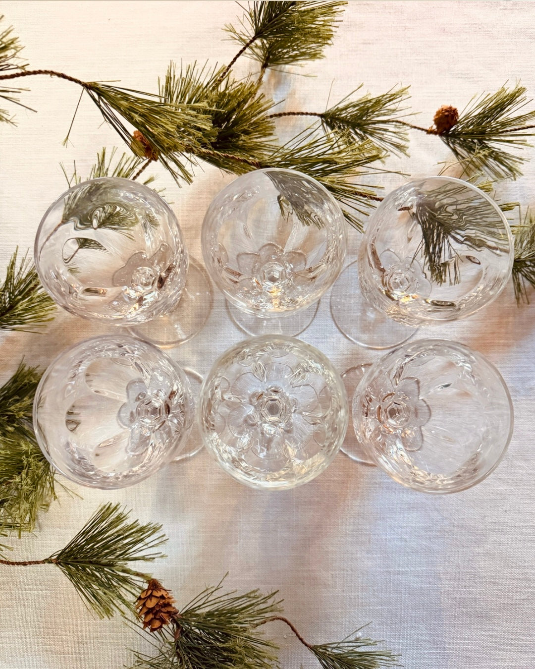 Prachtige set van zes vintage kristallen wijnglazen met een elegante geslepen kelk en verfijnde steel. De glazen hebben een tijdloos ontwerp dat zowel klassiek als feestelijk oogt – perfect voor een gedekte (kerst)tafel of een bijzonder diner.
